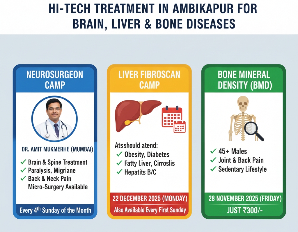 ब्रेन, लिवर और हड्डी के रोगों का अंबिकापुर में हाई-टेक इलाज: फिरदौसी हॉस्पिटल में मुंबई के न्यूरो सर्जन संग ₹300 में BMD जांच और लिवर फाइब्रोस्कैन कैंप की सुविधा।