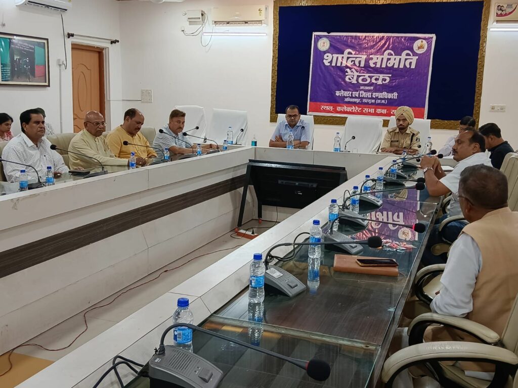 अम्बिकापुर 11 जून 2024/ प्रतिवर्ष की भांति इस वर्ष भी 17 जून 2024 को ईद-उल-जुहा बकरीद त्यौहार का आयोजन किया जाना है। आयोजन की आवश्यक तैयारी के संबंध में कलेक्टर श्री विलास भोसकर और पुलिस अधीक्षक श्री विजय अग्रवाल के मार्गदर्शन में मंगलवार को शांति समिति की बैठक कलेक्टर सभाकक्ष में हुई। प्रभारी कलेक्टर श्री सुनील नायक एवं अतिरिक्त पुलिस अधीक्षक श्री अमोलक सिंह ने बैठक लेकर त्यौहार के बेहतर आयोजन पर समिति से चर्चा की।