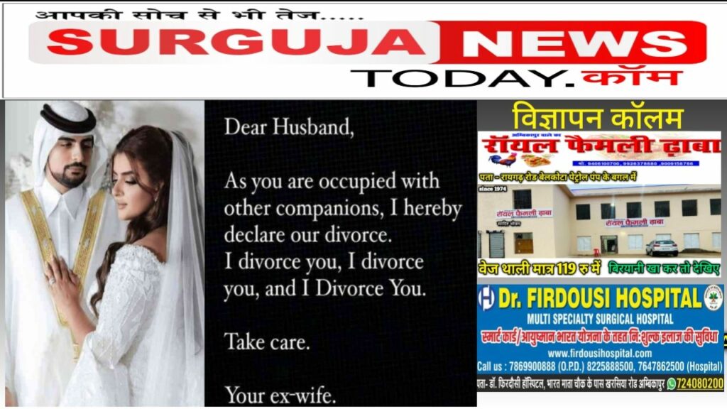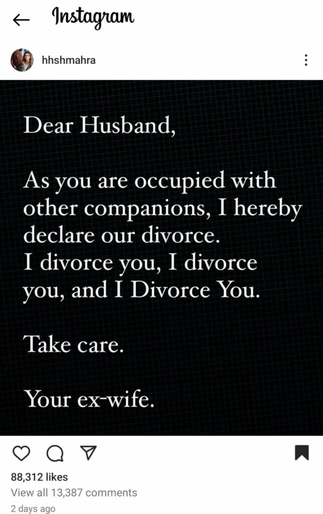 दुबई की राजकुमारी ने अपने इंस्टाग्राम पर कहा कि डियर हसबैंड, आप किसी और के साथ हैं, ऐसे में मैं आपको तलाक देने की घोषणा करती हूं। मैं आपको तलाक देती हूं, मैं आपको तलाक देती हूं और मैं आपका तलाक देती हूं। अपना ख्याल रखें…आपकी एक्स वाइफ।