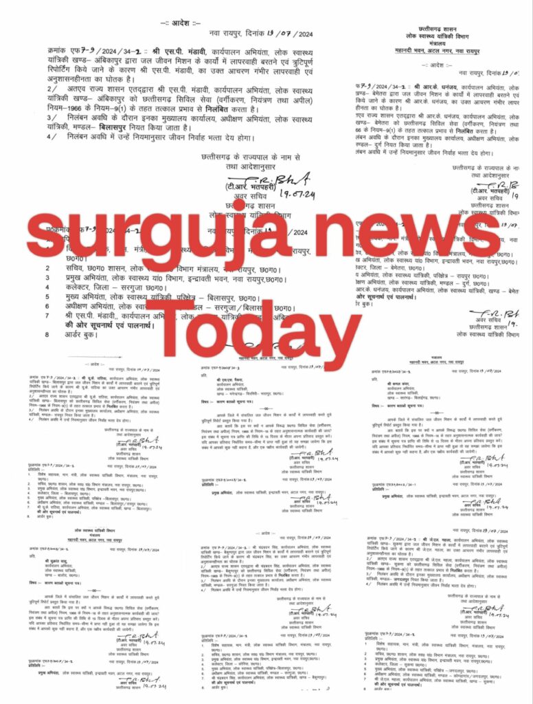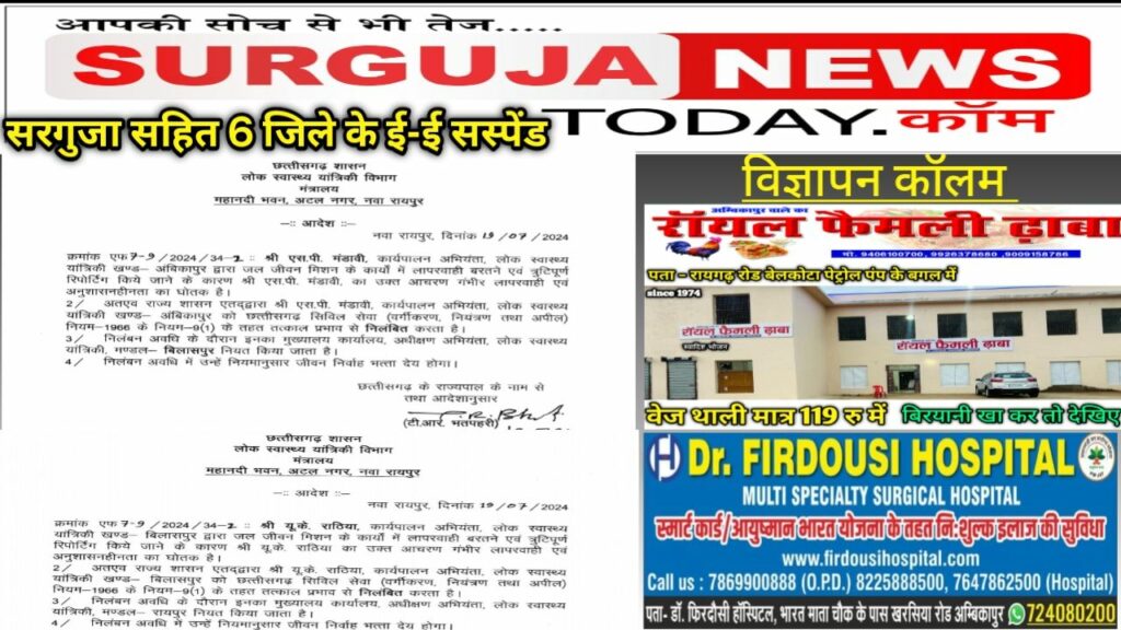 BREAKING-जल जीवन मिशन के कार्यों में लापरवाही सरगुजा सहित 6 जिलों के ईई सस्पेंड 4 को नोटिस जारी