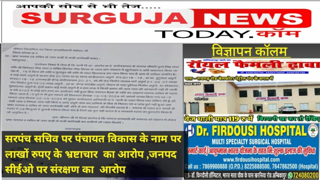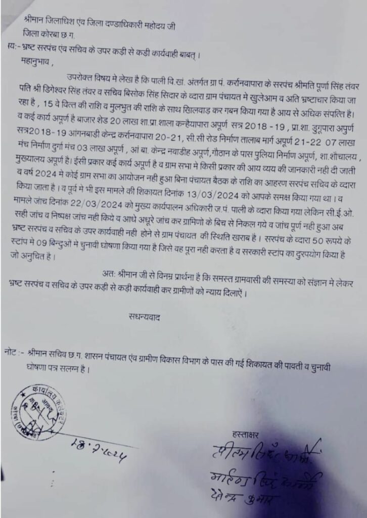 कर्रानवापारा के सरपंच सचिव पर पंचायत विकास के नाम पर लाखों रुपए के भ्रष्टाचार का आरोप ,जनपद सीईओ पर संरक्षण का आरोप ,कलेक्टर से की गई शिकायत ,देखें शिकायत पत्र