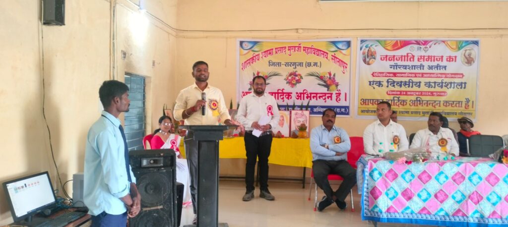 सीतापुर:- शासकीय श्यामा प्रसाद मुखर्जी महाविद्यालय में जनजातीय समाज का गौरवशाली अतीत- ऐतिहासिक, सामाजिक एवं आध्यात्मिक योगदान के विषय पर एकदिवसीय कार्यशाला का आयोजन किया गया। इस कार्यशाला के मुख्य अतिथि सीतापुर विधायक रामकुमार टोप्पो, विशिष्ट अतिथि रूपेश गुप्ता अध्यक्ष जनभागीदारी समिति शासकीय श्यामा प्रसाद मुखर्जी महाविद्यालय, पालक प्रतिनिधि राजकुमार गुप्ता, मुख्य वक्ता मुकेश कुमार नाग विभागाध्यक्ष फाॅर्मेसी संत गहिरा गुरू विश्वाविद्यालय अम्बिकापुर, विशिष्ट वक्ता के रूप में शिवभरोस बेक उरांव समाज प्रतिनिधि एवं मानसिंह ध्रुवे गोंड़ समाज प्रतिनिधि उपस्थित रहें।