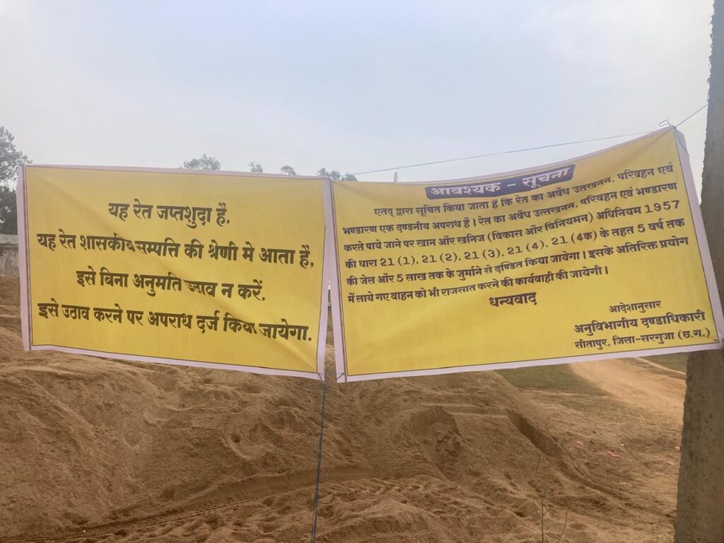 छत्तीसगढ़ के सीतापुर में प्रशासन की आखों में धूल झोंककर अवैध रूप से किये जा रहे रेत के कारोबार पर प्रशासन ने कार्यवाही कर दी है। एसडीएम के नेतृत्व में प्रशासन ने रेत के अवैध भंडारण पर दबिश देते हुए काफी मात्रा में रेत जब्त किया है। प्रशासन के इस कार्यवाही से रेत का अवैध कारोबार करने वालों में हड़कंप मच गया है।
