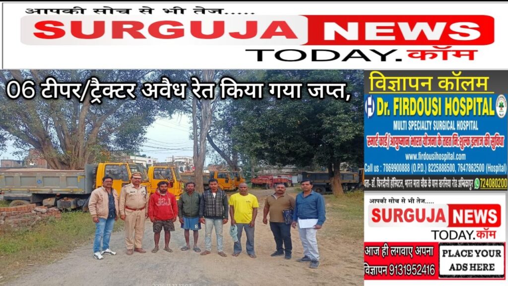 अवैध रेत परिवहन पर सरगुजा पुलिस एवं खनिज विभाग की संयुक्त कार्यवाही, 06 टीपर/ट्रैक्टर अवैध रेत किया गया जप्त, मामले मे अग्रिम कार्यवाही जारी।