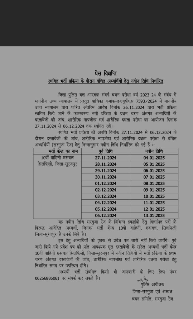 जिला पुलिस बल आरक्षक संवर्ग चयन परीक्षा वर्ष 2023 – 24 के के दौरान वंचित अभ्यार्थी होते नवीन तिथि निर्धारित की गई है