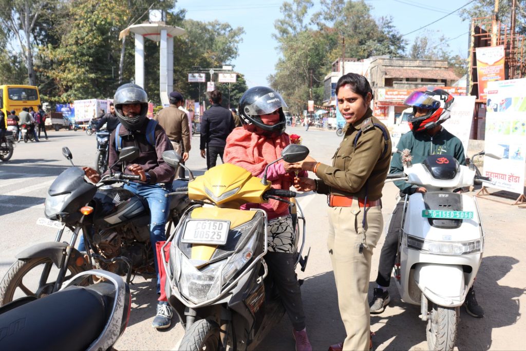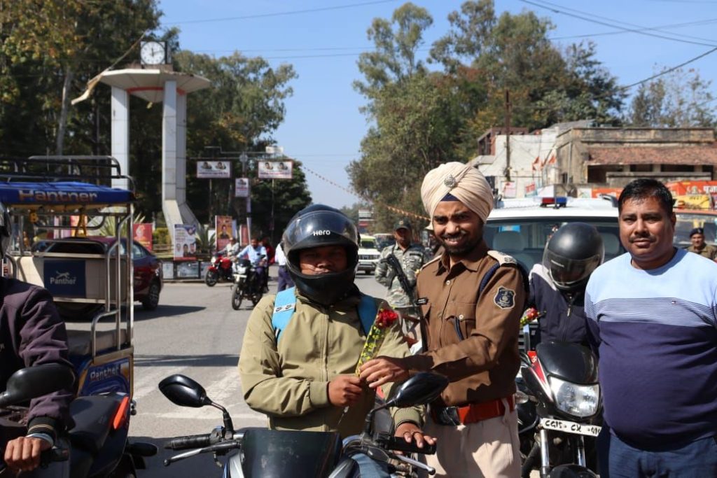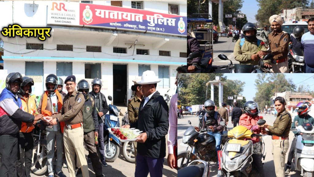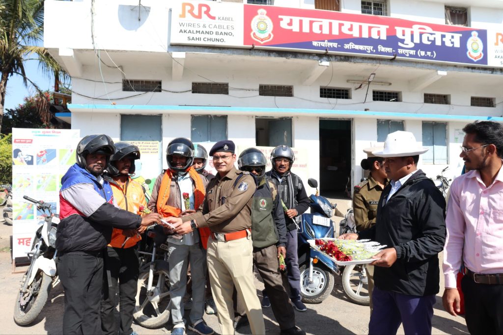 पुलिस अधीक्षक सरगुजा द्वारा हेलमेट पहन कर दुपहिया वाहन चलाने वाले वाहन चालकों को फूल प्रदान कर किया गया प्रोत्साहित