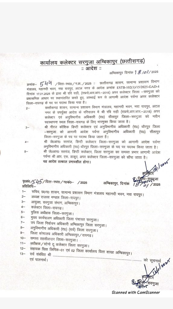 लुण्ड्रा धौरपुर के नए sdm होंगे डिप्टी कलेक्टर जे आर सतरंज तो वही डिप्टी कलेक्टर नीरज कौशिक बनाए गए सीतापुर अनुभाग के नए एसडीएम । छत्तीसगढ़ शासन सामान्य प्रशासन विभाग मंत्रालय द्वारा जारी आदेश के परिपालन में रवि राही अपर कलेक्टर एवं अनुविभागीय अधिकारी सीतापुर जिला सरगुजा को नवीन पद स्थापना स्थल जिला रायगढ़ के लिए भार मुक्त किया गया तो वहीं नीरज कौशिक डिप्टी कलेक्टर एवं अनुविभागीय अधिकारी धौरपुर जिला सरगुजा को आगामी आदेश पर्यंत तक सीतापुर के पद पर पदस्थ किया गया है तो वही जे आर सतरंज डिप्टी कलेक्टर जिला सरगुजा अंबिकापुर को आगामी आदेश पर्यंत तक धौरपुर लुण्ड्रा एसडीएम के पद पर पदस्थ किया गया है । वही जे आर सतरंज डिप्टी कलेक्टर जिला सरगुजा का समस्त प्रभार आगामी आदेश पर्यंत तक अपर कलेक्टर आर एस ठाकुर जिला सरगुजा को सौंपा गया ।