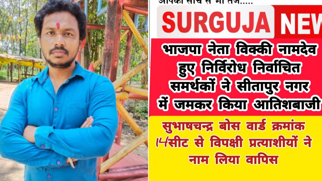 सीतापुर विशेष संवाददाता अलमीन अहमद:-सीतापुर नगरीय निकाय चुनाव का बिगुल बजने के बाद लोग अपने अपने समर्थकों के साथ नामांकन दाखिल कर जमकर शक्ति प्रदर्शन किए ऐसे में सीतापुर नगर पंचायत अंतर्गत सुभाष चन्द्र बोस वार्ड क्रमांक 14 सीट इस बार भाजपा युवा नेता विक्की नामदेव कि सुनामी में इस क़दर घबराई कि अन्य दलों के प्रत्याशीयों ने नामांकन दाखिल करने के बाद अपना नाम वापिस लिया जिसके बाद यह पार्षद सीट पहली मर्तबा निर्विरोध निर्वाचित होगा ,ऐसे में युवा भाजपा नेता विक्की नामदेव शहर के एकलौते युवा है जों पार्षद का चुनाव निर्विरोध लड़ेंगे