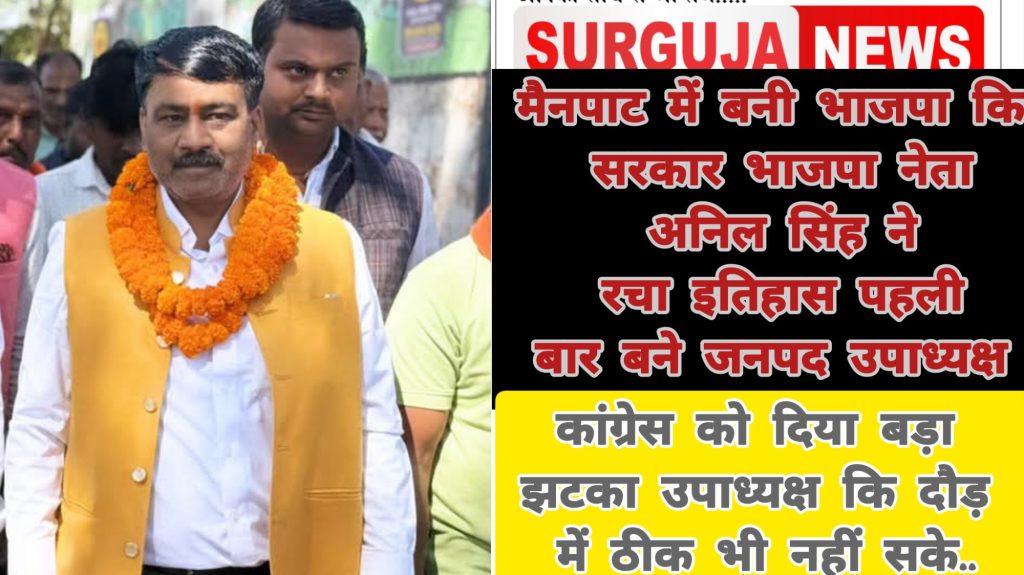सरगुजा जिले के मैनपाट में कांग्रेस का अभेद किला हुआ ध्वस्त भाजपा ने मैनपाट जनपद में खिलाया कमल भाजपा प्रत्याशी संतोषी पैकरा ने कांग्रेस प्रत्याशी सुशीला खेश को एक वोट से हराया वहीं भाजपा के सीनियर नेता अनिल सिंह निर्विरोध निर्वाचित हुए जनपद उपाध्यक्ष दरासल लम्बे समय से भाजपा मैनपाट जनपद में कब्जा जमाने के लिए लगातार संघर्ष कर रही थी, ऐसे में जनपद सदस्य क्षेत्र क्रमांक 13 सीट से इस बार जनता ने अनिल सिंह को जिताकर भेजा जिसके बाद आज़ उन्हें निर्विरोध उपाध्यक्ष बनाया गया जिसके बाद कमल फुल और भाजपा के जयकारों से गूंज उठा मैनपाट जिसके बाद अनिल सिंह को फुलमाला से जमकर अभिवादन किया गया और उनके सभी कार्यकर्ताओं में उत्साह का माहौल देखने को मिला जगह जगह अतिसबाजी हुई वहीं उनके समर्थकों एवं परिवारजनों में हर्षोल्लास का माहौल है। वहीं निर्विरोध निर्वाचित होने पर भाजपा नेता अनिल सिंह ने सभी कार्यकर्ताओं एवं समर्थकों का आभार व्यक्त किया।
