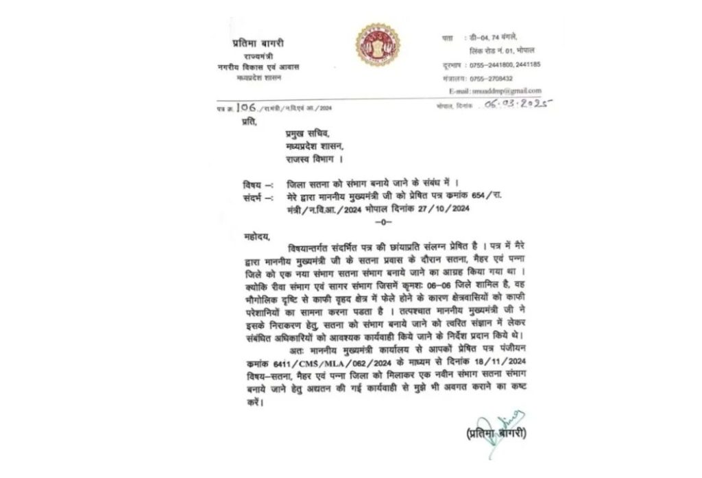 राज्यमंत्री प्रतिमा बागरी ने सीएम मोहन यादव को पत्र लिखते हुए जिक्र किया कि पत्र में मेरे द्वारा माननीय मुख्यमंत्री जी के सतना प्रवास के दौरान सतना, मैहर एवं पन्ना जिले को एक नया संभाग सतना संभाग बनाए जाने का आग्रह किया गया था। क्योंकि रीवा संभाग एवं सागर संभाग 06-06 जिले शामिल है, वह भौगोलिक दृष्टि से काफी वृहद क्षेत्र में फेले होने के कारण क्षेत्रवासियों को काफी परेशानियों का सामना करना पड़ता है।