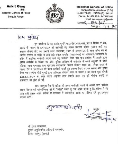 दिनांक 24 अप्रैल 2025 को सरगुजा रेंज के पुलिस महानिरीक्षक अंकित गर्ग (IPS) द्वारा जारी पत्र में धुर्वेश जायसवाल के नेतृत्व में SAFEMA अधिनियम के तहत की गई जब्ती की कार्रवाई की प्रशंसा की गई है। यह कार्रवाई 1985 के ‘धन के अति अर्जन और संपत्ति की जब्ती अधिनियम’ के अंतर्गत की गई, जिसमें एक आरोपी की अवैध संपत्ति—लगभग 1.38 करोड़ रुपये मूल्य की—की जब्ती की प्रक्रिया को प्रभावी ढंग से पूर्ण किया गया।