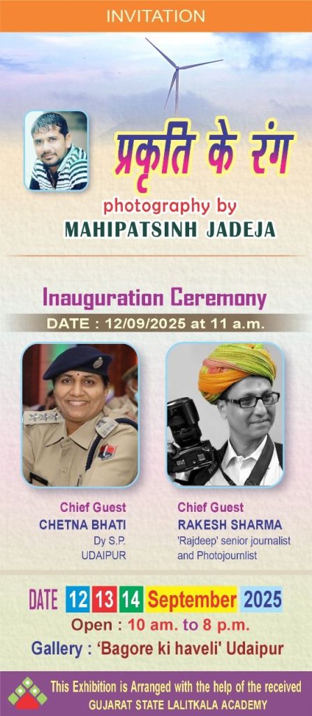 उदयपुर, 12 सितंबर। शहर के गणगौर घाट स्थित ऐतिहासिक बागोर की हवेली कला दीर्घा में शुक्रवार को ‘कुदरत के रंग’ नामक फोटो प्रदर्शनी का शुभारंभ चेतना भाटी DYSP उदयपुर के हाथों से होगा। गुजरात ललित कला अकादमी के सहयोग से आयोजित यह प्रदर्शनी गुजरात के फोटोग्राफर महीपत सिंह जडेजा के छायाचित्रों पर केंद्रित है। इसमें गुजरात की और अन्य जगहों की सूर्य दर्शन के ऊपर फोटोग्राफी को सजीव रूप में प्रस्तुत किया गया है।