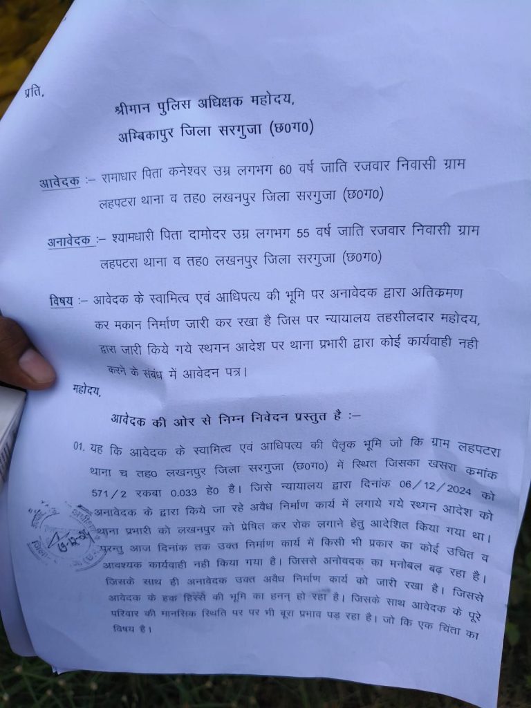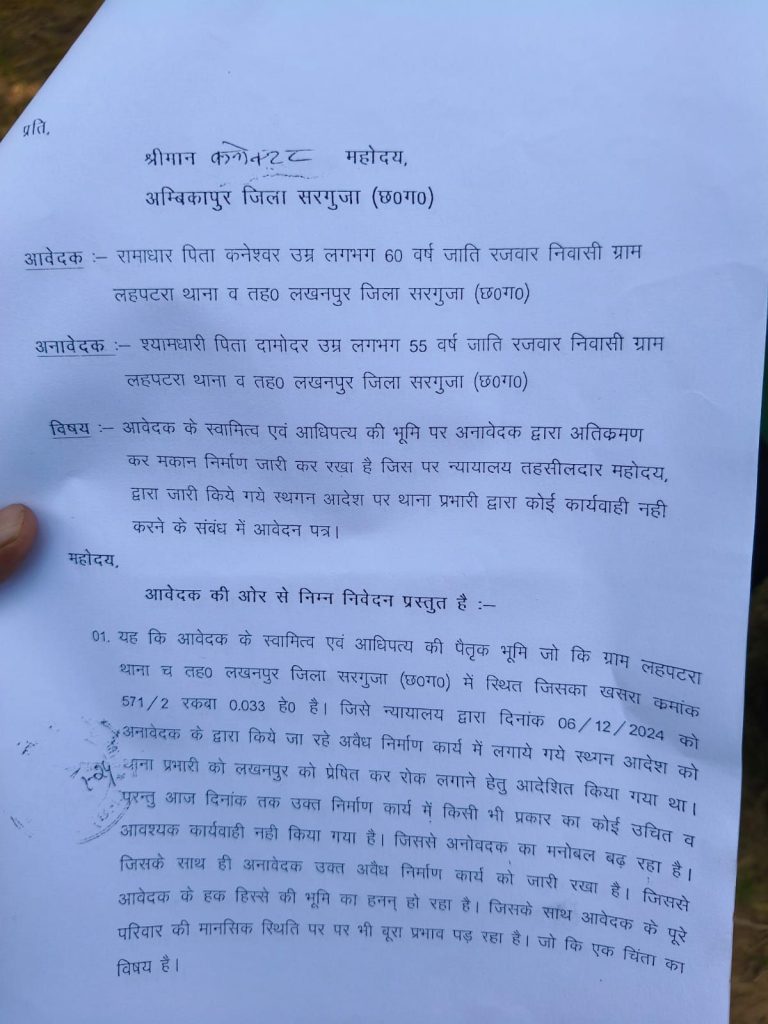 आवेदक का आरोप है हल्का पटवारी और आर आई मौके जांच करने गांव पहुंच और किसी को बिना बुलाए पंचनामा तैयार कर जांच रिपोर्ट तहसील न्यायालय में पेश कर दिया गया इसके बाद स्थगन आदेश को समाप्त कर दिया गया। आवेदक ने एसडीएम न्यायालय में आवेदन पेश किया। एसडीएम न्यायालय से मामले में जनवरी माह 2025 को स्थगन आदेश पारित कार उक्त भूमि पर दोनों पक्षों को किसी निर्माण करने रोक लगाया गया और अनावेदक को न्यायालय में उपस्थित होने कहा गया। एसडीएम न्यायालय में अनावेदक को दस्तावेज प्रस्तुत करने के लिए कहा गया परंतु अनावेदक द्वारा कोई भी दस्तावेज प्रस्तुत नहीं किया गया। दो मन भी जाने के बाद भी मामले का निराकरण नहीं होने के बाद अनावेदक श्यामधारी के द्वारा न्यायालय के आदेश की अवहेलना करते हुए उक्त भूमि पर मकान निर्माण कर ढलाई का कार्य शुरू कराया जा रहा था। आवेदक पक्ष लखनपुर थाने पहुंचा जहां जमीन संबंधित मामला होने पर पुलिस ने धारा 174 के तहत फ़ैना काटकर न्यायालय जाने की सलाह आवेदक पक्ष को दी।पीड़ित परिवार खुद की जमीन पानी के लिए नया नहीं मिलने पर क्षुब्ध होकर ग्रामीण परिवार ने 22 सितंबर दिन सोमवार से अनिश्चितकालीन भूख हड़ताल शुरू कर दी है न्याय नहीं मिलने पर ग्रामीण परिवार आत्मदाह की चेतावनी भी दी है। पीड़ित परिवार शासन से न्याय की गुहार लगा रहा है अब देखने वाली बात होगी कि क्या पीड़ित परिवार को न्याय मिल पाएगा।