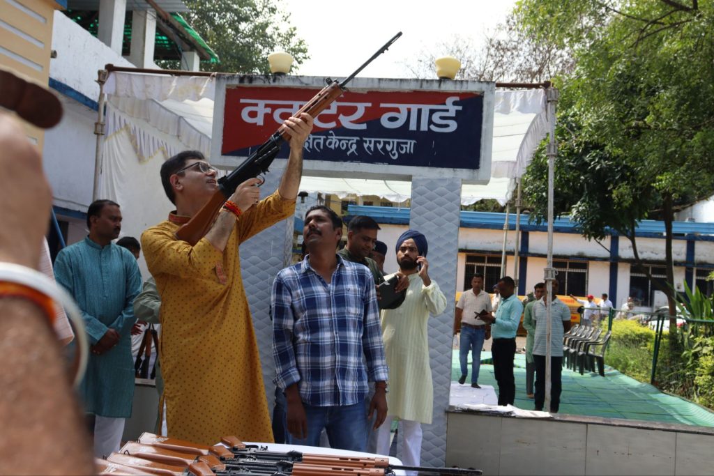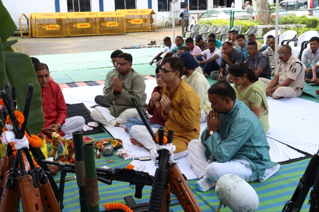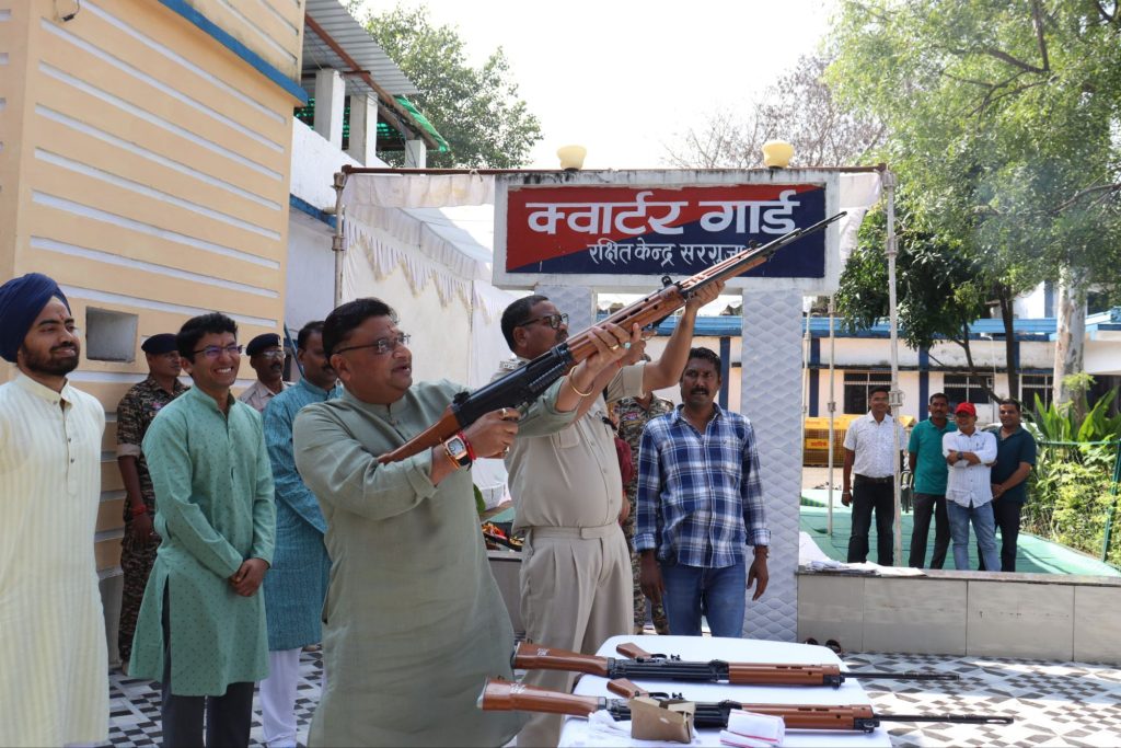 Inspector General of Police, Surguja Range and Superintendent of Police, Surguja fired a celebratory shot after worshipping weapons and vehicles.
