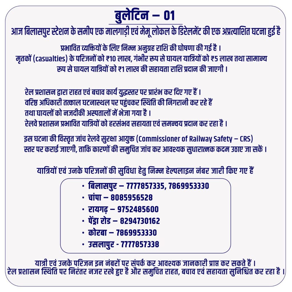 • बिलासपुर कलेक्टर संजय अग्रवाल ने 7 लोगों की मौत की पुष्टि की है, 2 लोग बोगी के अंदर फंसे हैं।
