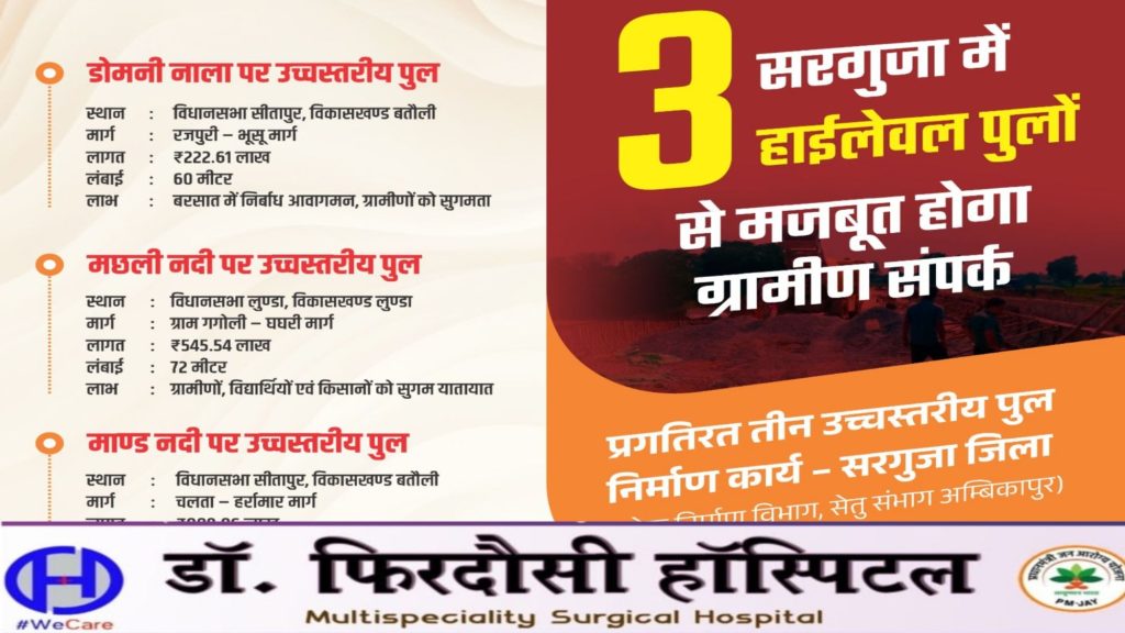 इन पुलों के निर्माण से सरगुजा जिले के दूरस्थ अंचलों के ग्रामीण क्षेत्रों को मुख्य सड़कों से जोड़ने में सहायता मिलेगी, जिससे आवागमन, शिक्षा, स्वास्थ्य एवं आर्थिक गतिविधियों में व्यापक सुधार होगा।