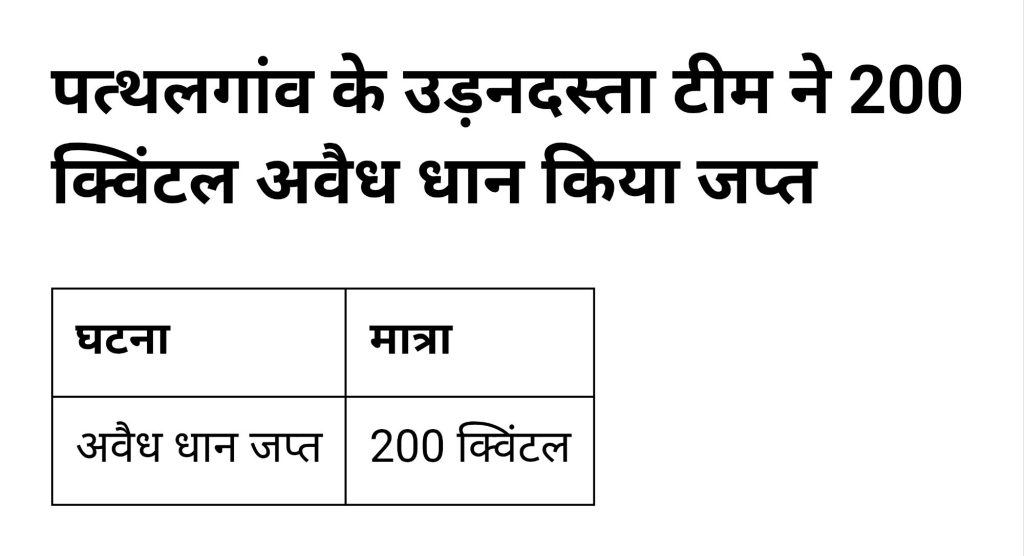 पत्थलगांव के उड़नदस्ता टीम ने 200 क्विंटल अवैध धान किया जप्त