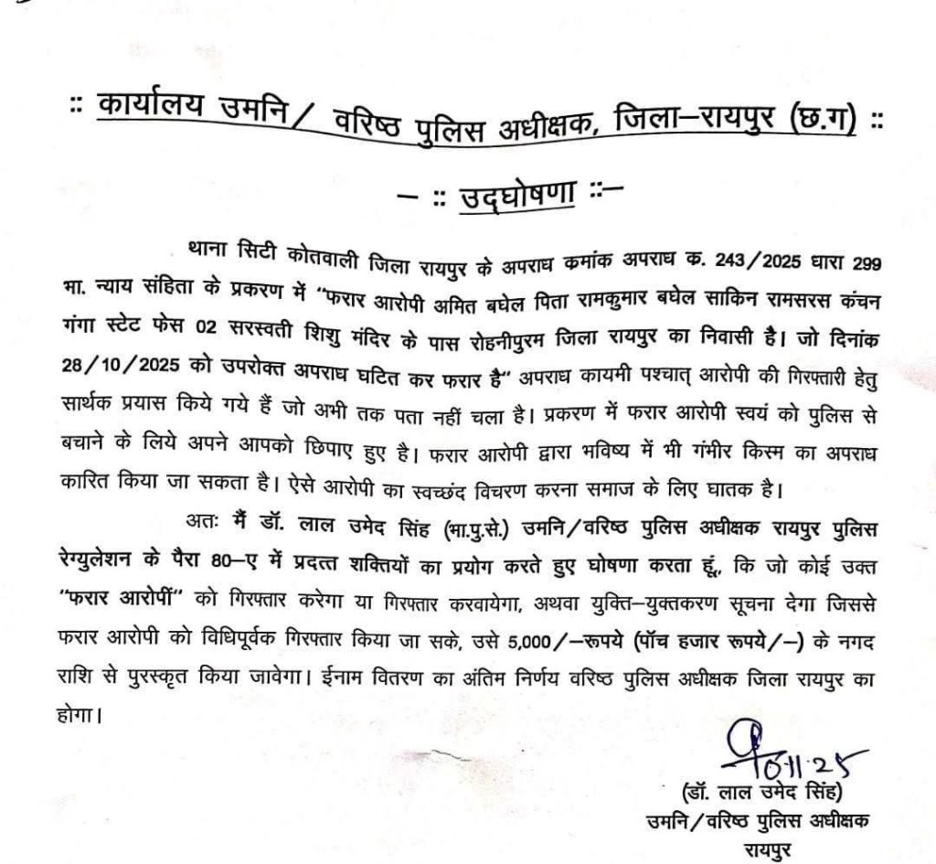 वरिष्ठ पुलिस अधीक्षक डॉ. लाल उमेद सिंह (भा.पु.से.) ने बताया कि थाना सिटी कोतवाली रायपुर में अपराध क्रमांक 243/2025 धारा 299 भा.दं.सं. के तहत दर्ज प्रकरण में आरोपी अमित बघेल पिता रामकुमार बघेल, निवासी रामसरस कंचन गंगा स्टेट फेस-02, सरस्वती शिशु मंदिर के पास, रोहनीपुरम, रायपुर घटना के बाद से फरार है।