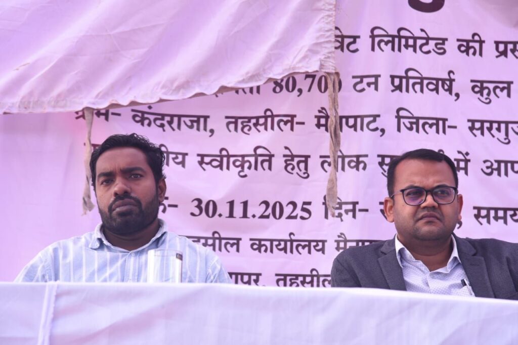 अम्बिकापुर 01 दिसम्बर 2025 जिले की तहसील मैनपाट के ग्राम कंडराजा में मेसर्स कुदरगढ़ी स्टील्स प्रा. लि. की प्रस्तावित बाक्साईट माइन परियोजना के लिए आयोजित जनसुनवाई कल दिनांक 30 नवंबर 2025 को संपन्न हुई। जनसुनवाई में लगभग 500 ग्रामीणों की उपस्थिति रही, जिनमें से 110 ग्रामीणों ने परियोजना के पक्ष एवं विपक्ष में अपने सुझाव तथा आपत्तियाँ प्रस्तुत कीं।