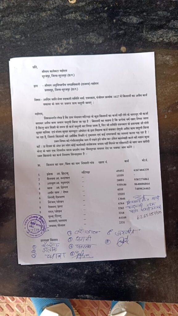 सूरजपुर/प्रतापपुर:– विकासखंड अंतर्गत आदिम जाति सेवा सहकारी समिति मर्यादित दवनकरा एक बार फिर गंभीर आरोपों के घेरे में है। ग्राम पंचायत मटिंगड़ा सहित आसपास के गांवों के किसानों ने समिति प्रबंधन पर बिना ऋण लिए भी कर्जदार बताकर जबरन अवैध वसूली करने का आरोप लगाया है। इस संबंध में किसानों द्वारा कलेक्टर सूरजपुर के नाम ज्ञापन सौंपते हुए अनुविभागीय दण्डाधिकारी (राजस्व) प्रतापपुर के माध्यम से शिकायत दर्ज कराई गई है।
