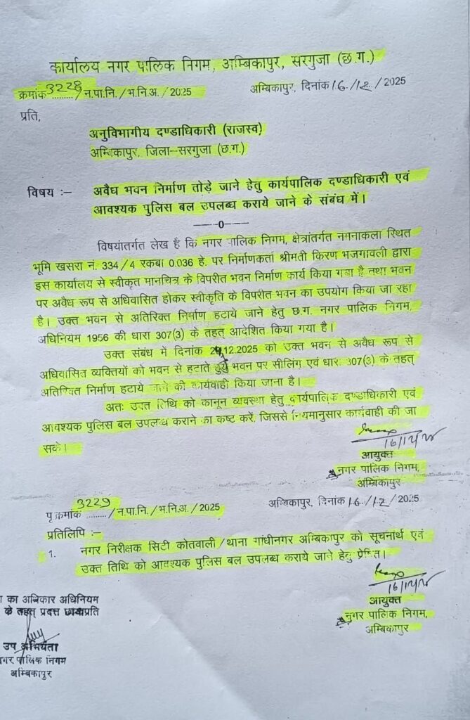 अंबिकापुर में अवैध निर्माण पर निगम सख्त, नमनाकला में भवन सीलिंग की तैयारी