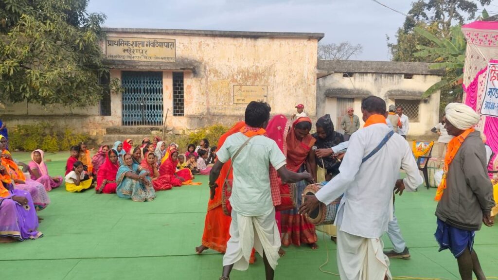 कार्यक्रम की शुरुआत सर्वप्रथम भारत माता के छाया चित्र में धूप,अगरबत्ती प्रज्वलित कर तथा उपस्थित सभी बंधुओं एवं मातृशक्तियों के द्वारा पुष्प अर्पित कर शुरुआत किया गया।मुख्य अतिथि श्रीमान प्रदीप झा जी, गांव के वरिष्ठ सियान (सरपंच के दादा जी) श्री सुखनंदन सिंह जी,एवं मातृशक्ति के रूप में अध्यक्षता करने वाली गांव की पनडाइन श्रीमती रूखमेन यादव जी के द्वारा किया गया। तत्पश्चात सभी अतिथियों एवं वरिष्ठ जनों का स्वागत किया गया। इसके बाद गाँव के स्कूली बालिकाओं द्वारा स्वागत गीत प्रस्तुत किया गया, तत्पश्चात श्री बालकुमार राजवाड़े जी के द्वारा मां भारती की वंदना गीत गाया गया। सरगुजा की लोक सांस्कृतिक कर्मा नृत्य श्री रामदास एवं उनके टोली के द्वारा प्रस्तुत किया गया,श्री राम साय एवं जीवन लाल द्वारा शिवचर्चा के विषय में विचार रखा गया एवं सुखदेव यादव के द्वारा विरहा गीत गाया गया।नर्मदा राजवाड़े जी एवं उनकी टोली के द्वारा वाद्य यंत्रों के साथ मां भारती एवं भगवान श्री राम जी का भजन प्रस्तुत किया गया।इस प्रकार जनजातीय समुदाय एवं हिंदू सनातन धर्म की कई रूप कार्यक्रम में देखने को मिला।मुख्य वक्ता श्रीमान प्रदीप झा जी के द्वारा सभी लोगों को संगठित रहने एवं पञ्च परिवर्तन के विषय में उद्बोधन दिया गया ,उनके द्वारा बताया गया कि हमारी संस्कृति और संस्कारों का संरक्षण होता रहे