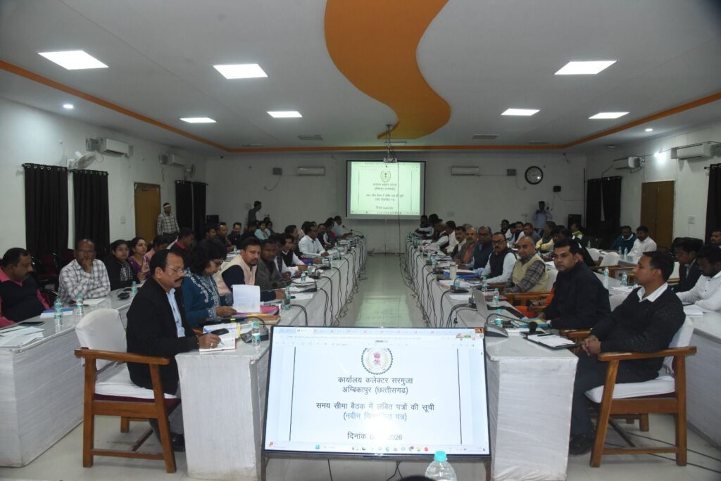 अंबिकापुर 03 फरवरी 2026  कलेक्टर श्री अजीत वसंत की अध्यक्षता में मंगलवार को जिला पंचायत सभाकक्ष में साप्ताहिक समय-सीमा की बैठक आयोजित की गई। बैठक में संचालित योजनाओं एवं कार्यक्रमों की विस्तृत समीक्षा कर कलेक्टर ने सम्बंधित अधिकारियों को आवश्यक दिशा-निर्देश दिए। बैठक में जिला पंचायत सीईओ श्री विनय कुमार अग्रवाल, अपर कलेक्टर श्री सुनील नायक, श्री राम सिंह ठाकुर, श्री अमृत लाल ध्रुव, नगर निगम आयुक्त श्री डी.एन. कश्यप सहित विभिन्न विभागों के अधिकारी उपस्थित रहे