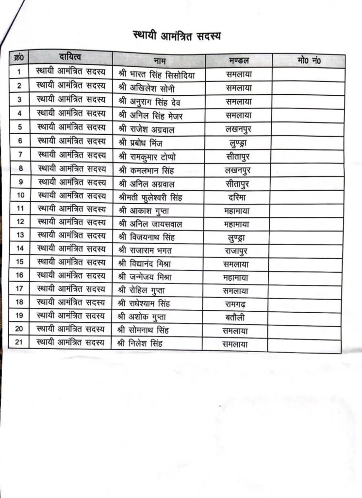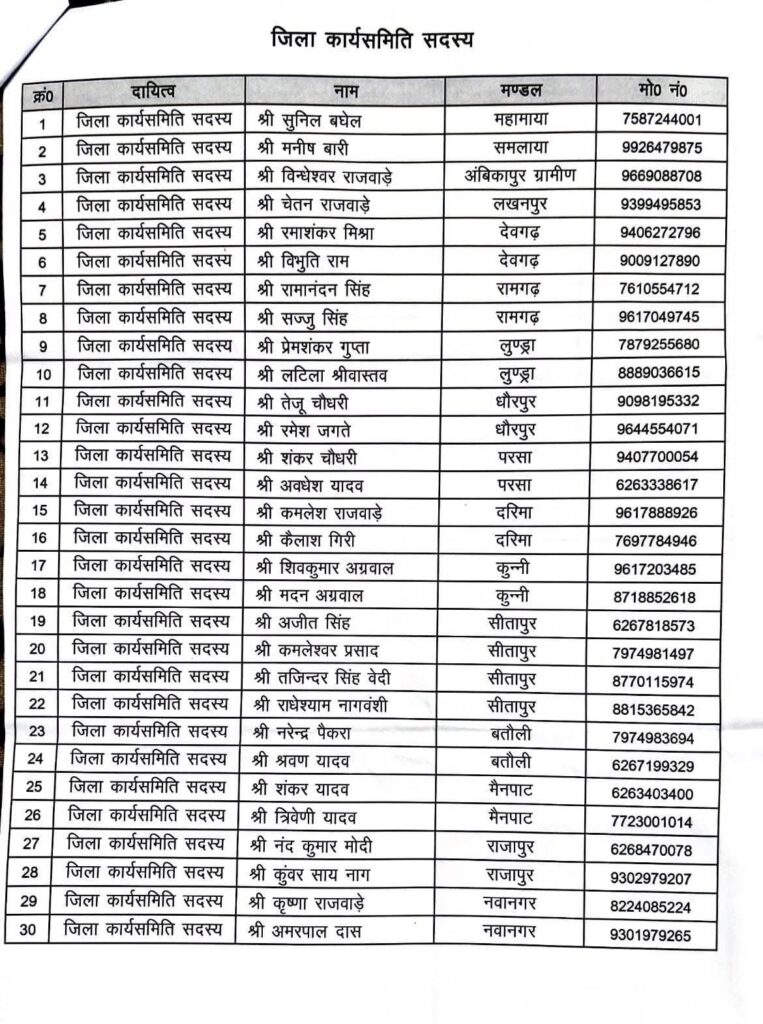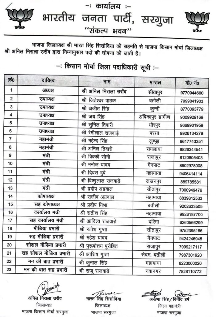 भारतीय जनता पार्टी सरगुजा जिला किसान मोर्चा का संगठन विस्तार किया गया है। भाजपा सरगुजा जिलाध्यक्ष श्री भारत सिंह सिसोदिया की सहमति से किसान मोर्चा जिलाध्यक्ष श्री अनिल निराला उरांव द्वारा नव नियुक्त जिला पदाधिकारी, मंडल अध्यक्ष, कार्यसमिति सदस्य, विशेष एवं स्थायी आमंत्रित सदस्यों के नामों की घोषणा की गई।