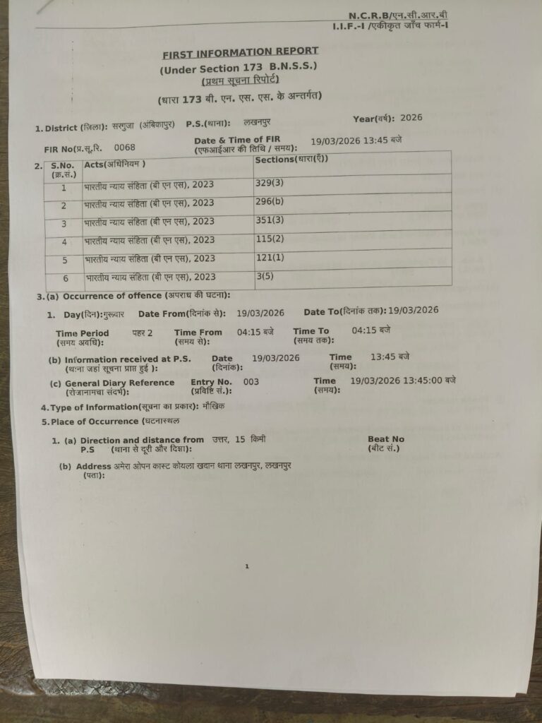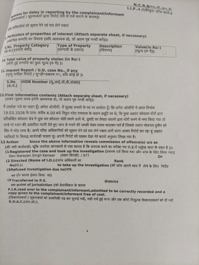 Ibraar khan snt news -लखनपुर थाना क्षेत्र अंतर्गत संचालित अमेरा खुली खदान में कोयला चोरी थमने का नाम नहीं ले रहा है। ड्यूटी में तैनात गार्डों द्वारा कोयला चोरी मना करने पर संगठित गिरोह के द्वारा उन पर हमला कर दिया जाता है। अमेरा खदान में ड्यूटी करने वाले लोगों में भय का माहौल बना हुआ है। कोयला चोरी करने वाले संगठित गिरोह फिर से सक्रिय हो गए हैं। अमेरा खदान में 19 मार्च दिन गुरुवार की तड़के सुबह लगभग 4 बजे कोयला चोरी करने ग्रामीणों का संगठित गिरोह खदान के अंदर पहुंचा कोयला चोरी करने के दौरान ड्यूटी में तैनात त्रिपुरा स्टेट राइफल के जवान उन्हें पकड़ने उनका पीछा कर लगा इसी दौरान संगठित गिरोह के सदस्यों ने पत्थर बाजी शुरू कर दी। पत्थर बाजी के दौरान त्रिपुरा राइफल का जवान मोईन हसन के सर में चोट लगा और सर से खून निकलने लगा।साथी जवानों के द्वारा एस ई सी एल केंद्रीय चिकित्सालय विश्रामपुर इलाज हेतु घायल जवान को ले जाया गया जहां डॉक्टरों की निगरानी में उपचार जारी है। अमेरा खदान ओसीसी सुरक्षा प्रभारी मोहम्मद रिजवान के द्वारा लखनपुर थाने पहुंचे रिपोर्ट दर्ज कराया है। लखनपुर पुलिस 329 (3)296 (b) 351 (3) 115(2) 121 (1) 3 (5) के तहत अपराध दर्ज करते हुए मामले की जांच में पुलिस जुटी है।