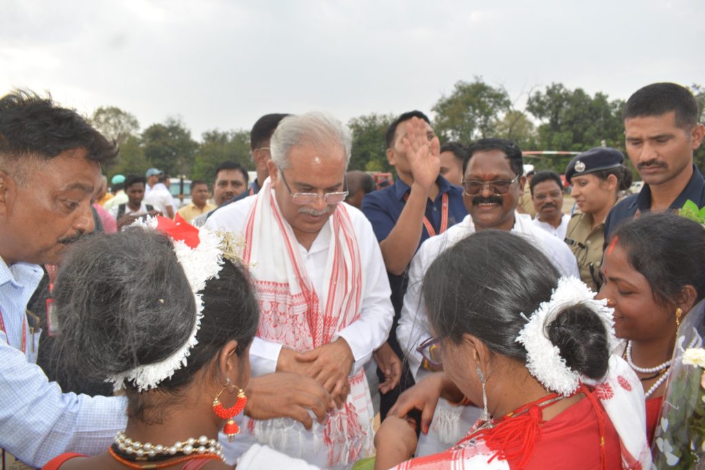 अम्बिकापुर 6 अप्रैल 2023/ मुख्यमंत्री श्री भूपेश बघेल का गुरुवार को पीजी कालेज ग्राउंड हेलीपैड पर आत्मीय स्वागत किया गया। श्री बघेल यहां मूली पढ़हा उरांव समाज के तत्वाधान में आयोजित खद्दी परब (सरहुल परब) में शामिल होने अम्बिकापुर पहुंचे थे।