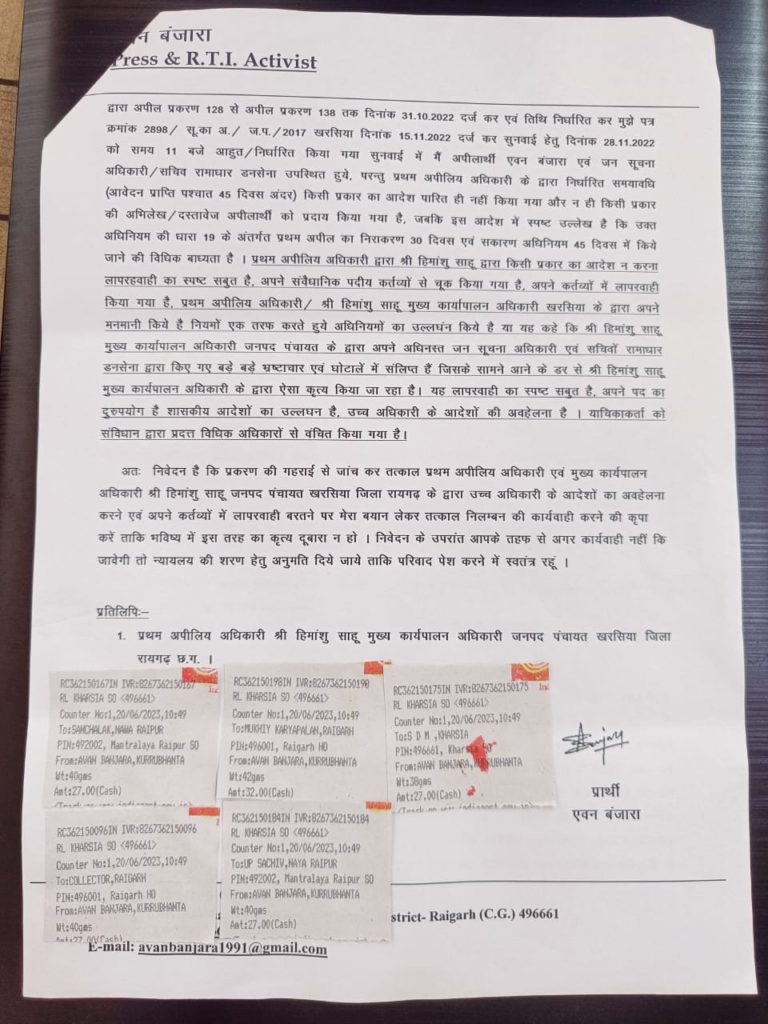 अपीलीय अधिकारी खरसिया के द्वारा सूचना के अधिकार का आदेशों का कर रहे अवहेलना :- एवन बंजारा