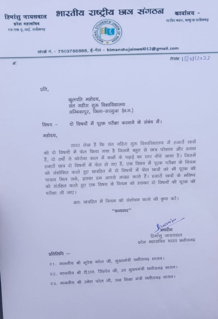 की एक विषयो में पूरक परीक्षा के नियम को संशोधित करते हुए छात्रहित में दो विषयो में फेल छात्रों को भी पूरक की पात्रता मिल सके जिससे हजारों छात्रों के भविष्य को संरक्षित हो सके अगर एक विषय के नियम को हटाकर दो विषयो की पूरक की परीक्षा होती है तो बहुत से छात्रों का साल बर्बाद होने से बच जायेगा ज्ञापन को प्रतिलिपि के साथ निवेदन पत्र छत्तीसगढ़ के मुख्यमंत्री श्री भूपेश बघेल जी, उप मुख्यमंत्री श्री टी एस सिंह देव जी एवम उच्च शिक्षा मंत्री श्री उमेश पटेल जी के नाम पत्र भेजा एवं छात्रहित में उचित निर्णय लेने की मांग किया ज्ञापन सौंपने वालों में पूर्व जिला उपाध्यक्ष सुरेंद्र गुप्ता, खेल प्रकोष्ठ एनएसयूआई के जिला अध्यक्ष रजत सिंह, वैभव पांडे,प्रमोद, आयुष आदि उपस्थित हुए।