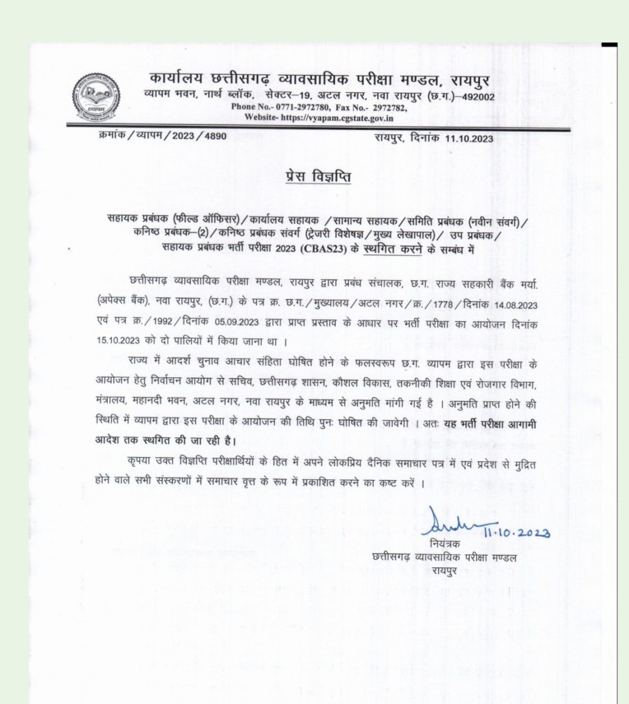 दिनांक 15-OCT-2023 को प्रस्तावित CBAS-2023 भर्ती परीक्षा चुनाव आचार संहिता होने के कारण स्थगित कर दी गई है। Vyapam,CHIPS