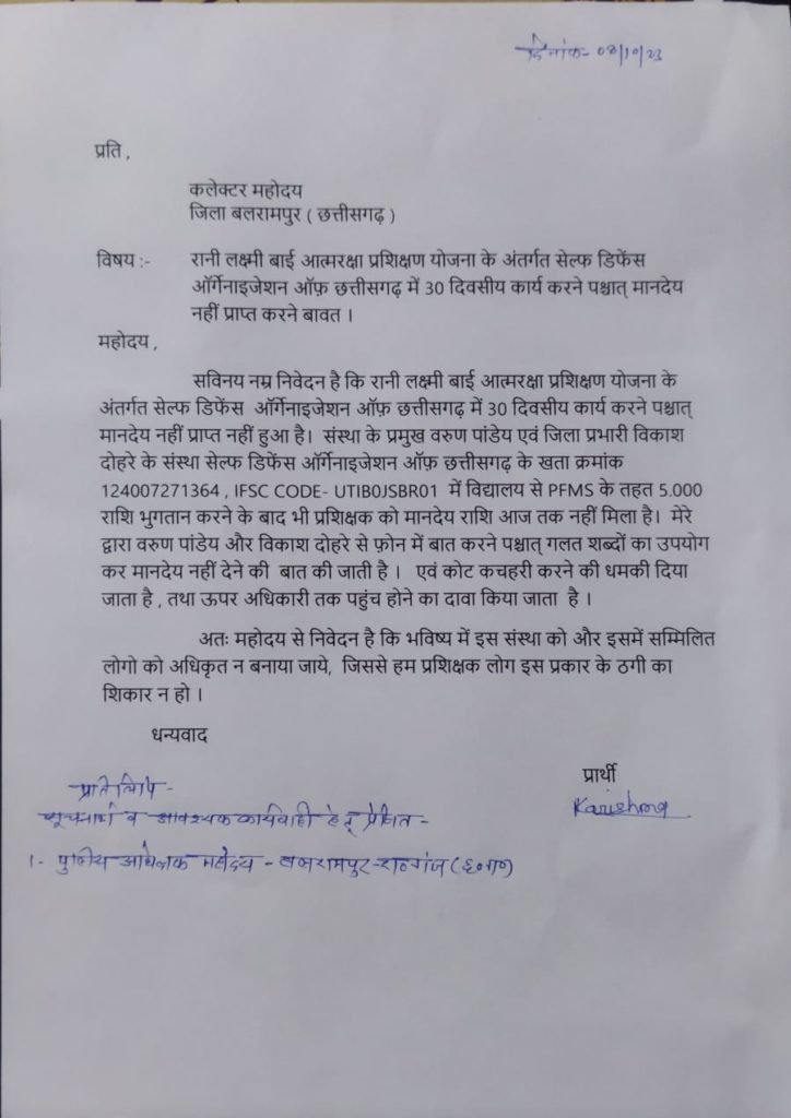 छत्तीसगढ़ सरकार की रानी लक्ष्मी बाई आत्मरक्षा योजना के तहत बलरामपुर जिले के स्कूलों में छात्राओं को सेल्फ डिफेंस सिखाने के लिए गत वर्ष सेल्फ डिफेंस आर्गेनाइजेशन ऑफ इंडिया को अधिकृत किया गया था। उक्त संस्था ने बलरामपुर जिले में करीब 50 प्रशिक्षकों को नियुक्त किया था। संस्था द्वारा उन्हें प्रतिदिन एक हजार रुपये का मानदेय दिया जाना था। प्रशिक्षण के बाद संस्था को निर्धारित राशि का भुगतान कर दिया, लेकिन संस्था ने प्रशिक्षकों को मानदेय का भुगतान नहीं किया। प्रशिक्षक वाड्रफनगर निवासी करिश्मा यादव ने बताया कि उसका 70 हजार का मानदेय नहीं दिया गया है। संस्था के छत्तीसगढ़ प्रभारी वरूण पांडेय व विकास दोहरे से पैसे मांगे जाने पर उन्हें धमकी दी जा रही है एवं अपशब्द कहे जा रहे हैं।