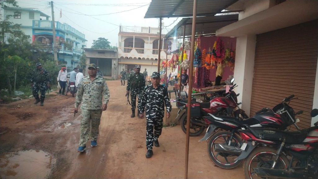 फ्लैग मार्च मे कंपनी कमांडरश्री कसमीरा थाना प्रभारी लुण्ड्रा संपत पोताई सहित सीआरपीएफ बटालियन ने फ्लैग मार्च निकाला।