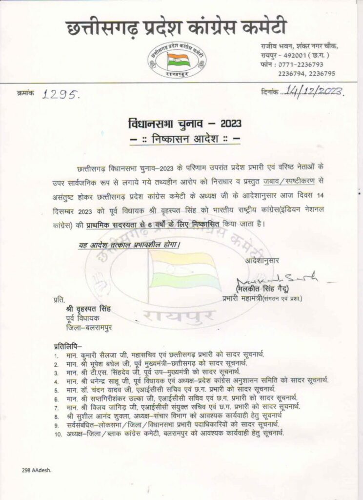 CG BREAKING : दो पूर्व विधायकों पर गिरी निष्कासन की गाज, कांग्रेस ने डॉ. विनय जयसवाल और बृहस्पत सिंह को 6 साल के लिए पार्टी से किया बाहर..