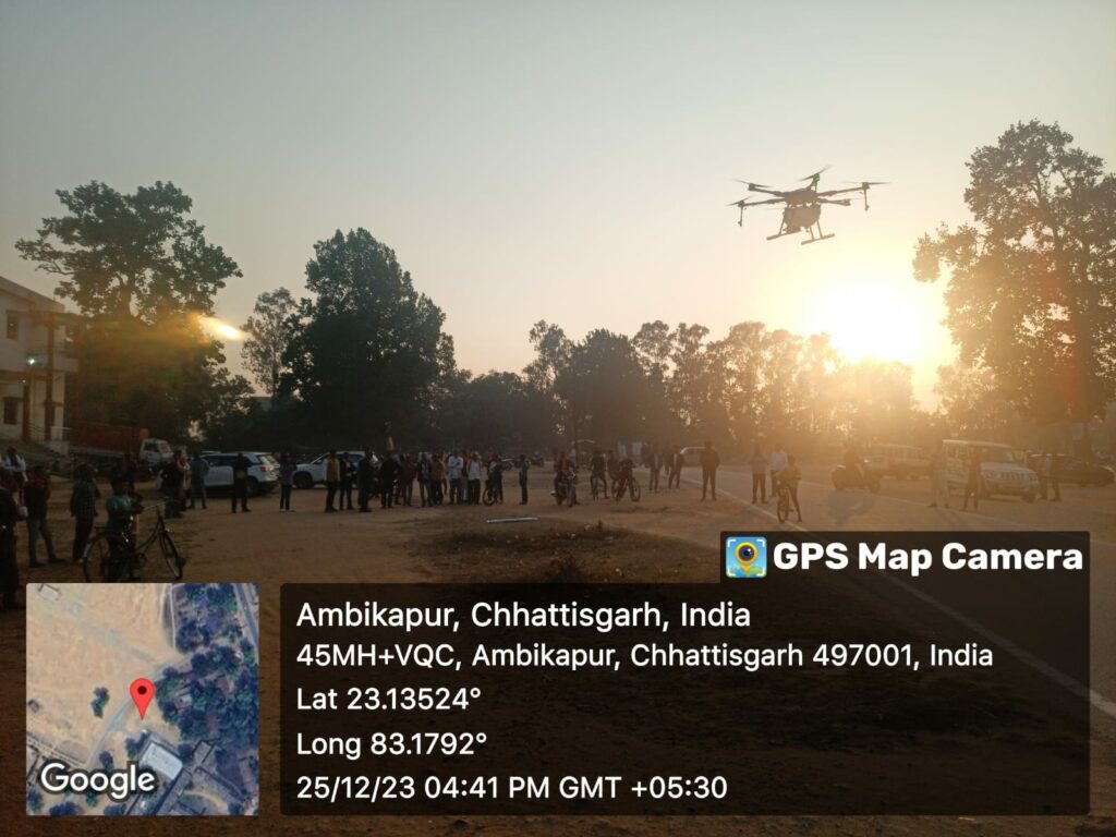 SHAIF FIRDOUSI अम्बिकापुर 26 दिसम्बर 2023 विकसित भारत संकल्प यात्रा के माध्यम से शासन की महत्वपूर्ण योजनाओं की आमजन को जानकारी दी जा रही है, साथ ही हितग्राहियों को लाभान्वित भी किया जा रहा है। इसी कड़ी में विकसित भारत संकल्प यात्रा के तहत मंगलवार को ग्राम पंचायत मुकुंदपुर और तुनगुरी में किसानों को ड्रोन से नैनो फर्टिलाइजर का छिड़काव का डेमो दिखाया गया।