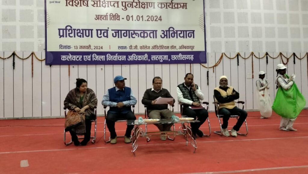अंबिकापुर 13 जनवरी 2024 कलेक्टर एवं जिला निर्वाचन अधिकारी सरगुजा श्री विलास भोस्कर के मार्गदर्शन में शनिवार को राजीव गांधी शासकीय स्नातकोत्तर महाविद्यालय के ऑडिटोरियम में सरगुजा जिले के समस्त महाविद्यालय के प्राचार्य नोडल प्राध्यापकों सहित केंपस एम्बेसडर व संस्था की टेक्निकल स्टाफ हेतु मतदाता जागरूकता कार्यशाला का आयोजन किया गया। इस अवसर पर सरगुजा जिले के समस्त हायर सेकेंडरी स्कूल के प्राचार्य व एक-एक टेक्निकल स्टाफ व नवीन मतदाता भी उपस्थित रहे।
