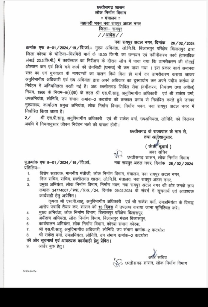 गुणवत्ताहीन निर्माण पर उप मुख्यमंत्री श्री अरुण साव ने सख्त कार्रवाई करते हुए लोक निर्माण विभाग के दो अधिकारियों को निलंबित किया और दो को कारण बताओ नोटिस जारी किया। चोटिया-चिरमिरी मार्ग के उन्नयन और नवीनीकरण कार्य में गुणवत्ताहीन निर्माण और अमानक कार्य पर कार्यवाई की गई।