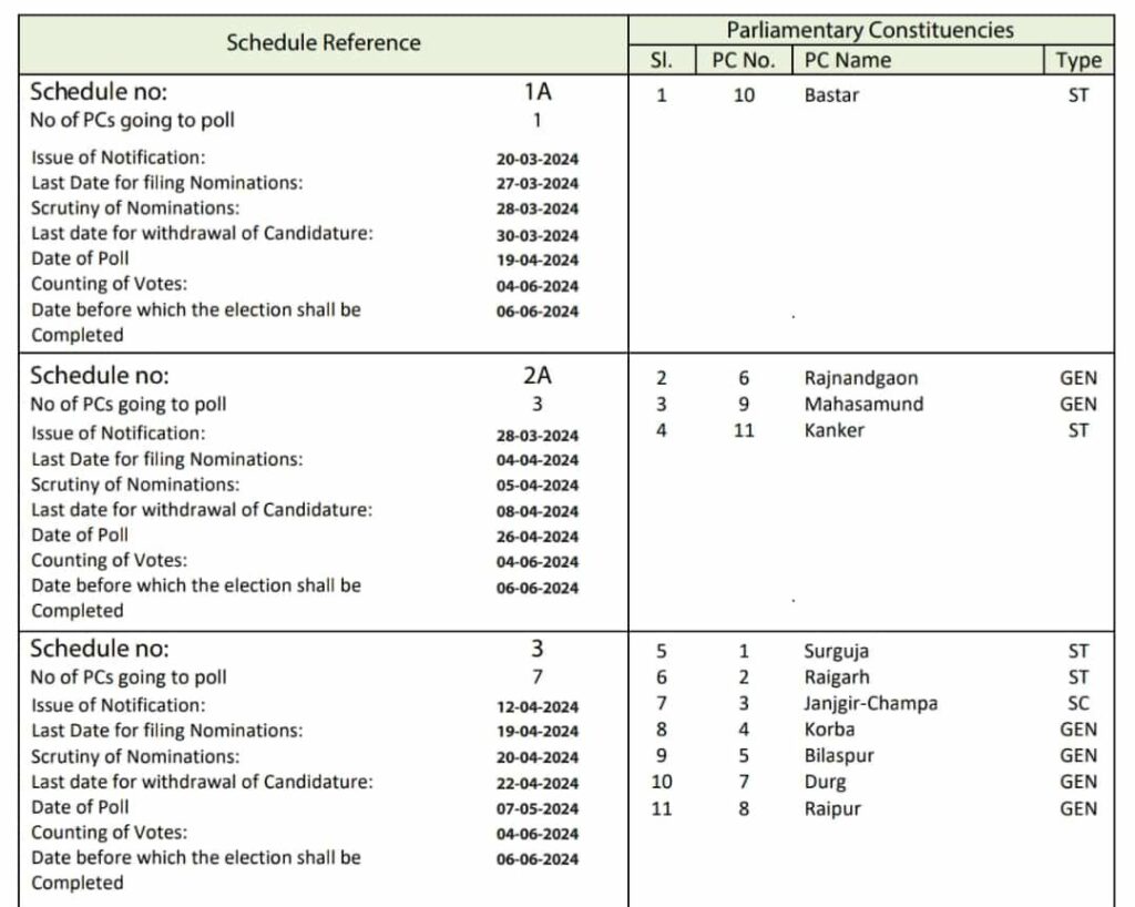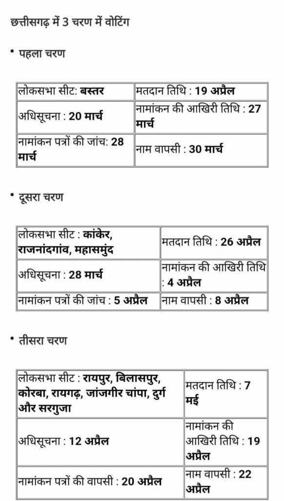 लोकसभा चुनाव के तारीखों का ऐलान हो गया है। छत्तीसगढ़ की 11 सीटों के लिए 3 चरणों में मतदान होगा। वहीं 7 चरणों में देश की 543 सीटों पर वोटिंग होगी। इसमें 19 अप्रैल को पहले चरण की वोटिंग होगी। वहीं 4 जून को लोकसभा चुनाव के नतीजे आएंगे।