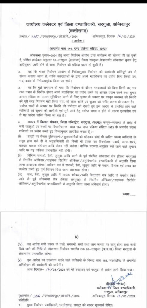 ब्रेकिंग -लोकसभा चुनाव के तारीखों के ऐलान के बाद सरगुजा में धारा 144 लागू