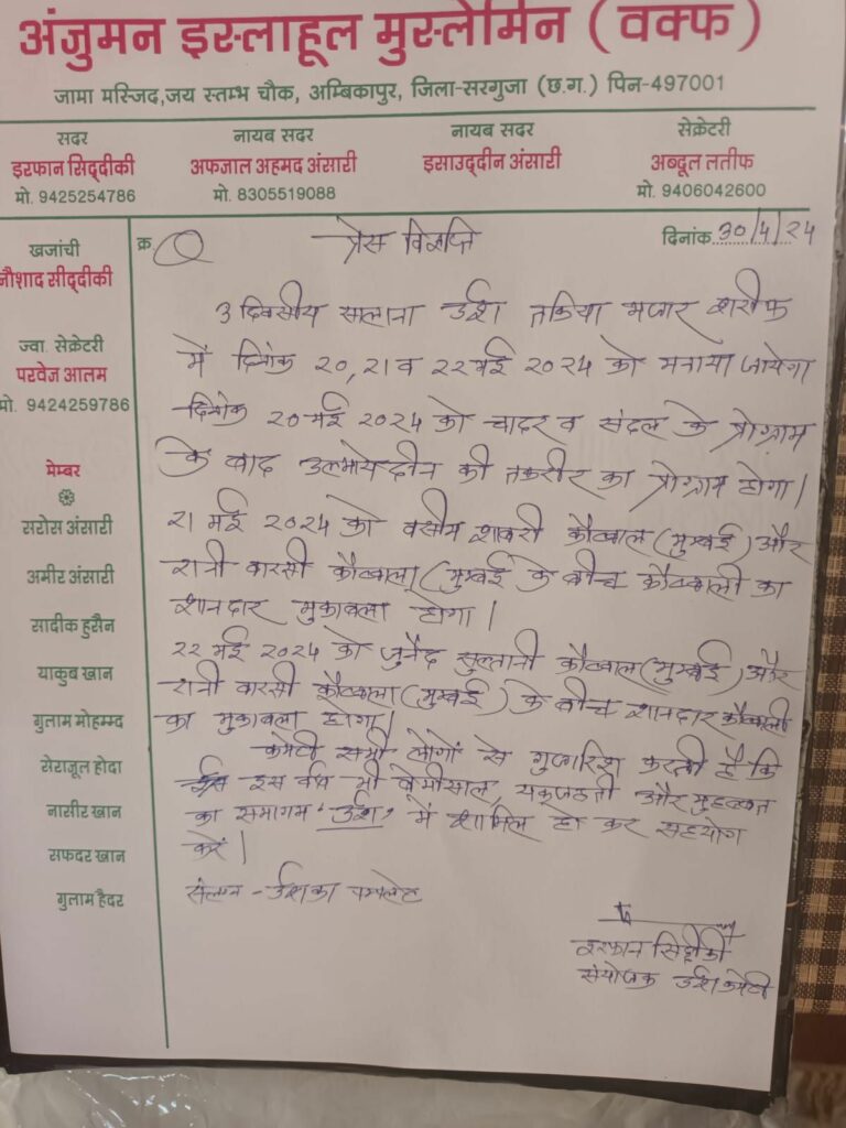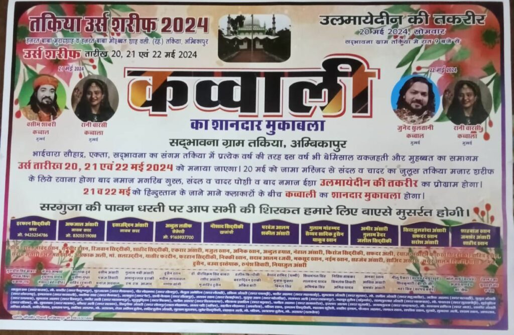 सरगुजा जिले के अम्बिकापुर में स्थापित ताकिया शरीफ़ में हर वर्ष सालाना उर्स का आयोजन किया जाता है इसी को मद्देनजर रखते हुए अंजुमन इसलाहुल मुस्लेमीन कमेटी अम्बिकापुर के तत्वावधान में इस वर्ष भी तीन दिवसीय सालाना उर्स का आयोजन तकिया शरीफ़ में किया गया है, जिसका तारीख 20.21.22 मई 2024को निर्धारित किया गया है,ताकिया शरीफ़ छत्तीसगढ़ के वलीयों के बादशाह हज़रत बाबा मुराद शाह व मोहब्ब्त शाह वली के दरगाह में लोग जियारत करने भारी संख्या में पहुंचते हैं यह स्थल हिंदू मुस्लिम सिख ईसाई सभी के लिए आस्था का केंद्र है, यहां सभी धर्म के लोग पहुंच कर अपनी मुरादें मांगा करते हैं और मुरादें पूरी होती है और तीनों दिन कवाली का महामुकाबला आयोजित होगा जिसमें महसुर कव्वाल जुनैद सुल्तानी ,वसीम शाबरी, रानी वारसी, शिरकत करेंगे ऐसे में सुरक्षा के लिहाज से पुलिसिंग व्यवस्था चाक-चौबंद रहने वाला है,, आयोजन समिति सदर अम्बिकापुर इरफान सिद्दिकी, सहित अंजुमन इसलाहुल मुस्लेमीन कमेटी ताकिय अम्बिकापुर।।