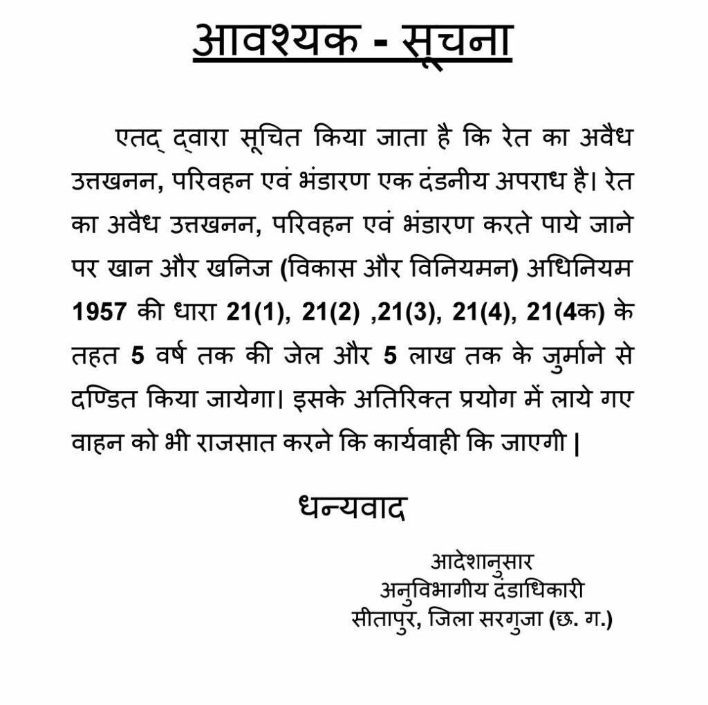 सरगुजा – रेत हो गया अवैध ! प्रश्न उठता है की क्या निर्माण कार्य रेत की जगह मिट्टी से होगा?
