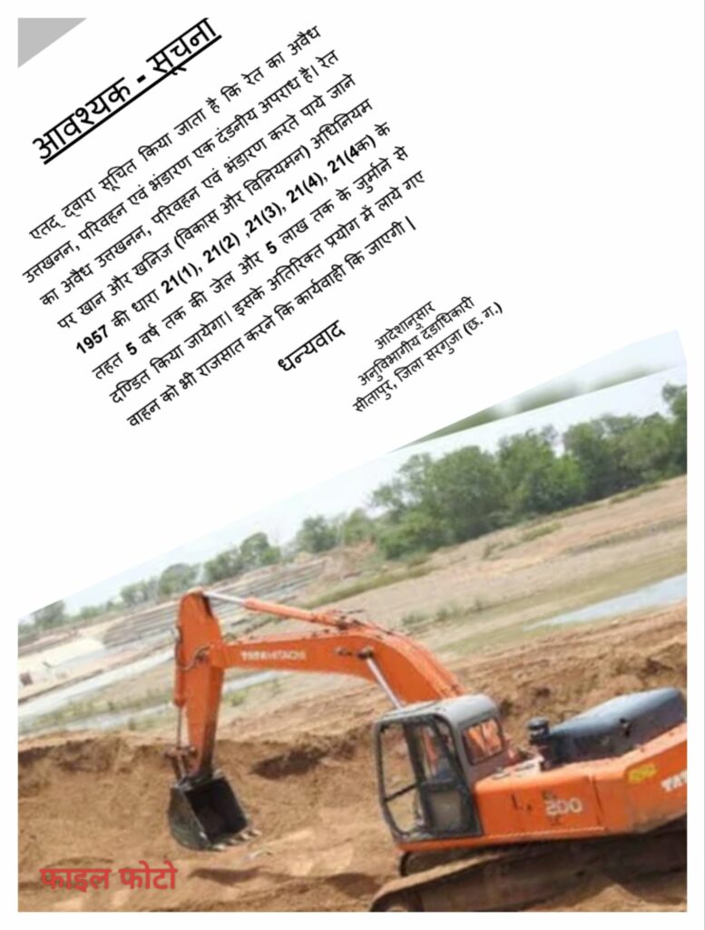 जिले में आदर्श आचार संहिता लागू है। और जिले के सीतापुर विधानसभा में प्रतापगढ़ जो रेत के लिए चर्चित नाम से जाना जाता हैं जहा से अगल बगल के विधानसभा क्षेत्र तक रेत की आपूर्ति की जाती है लेकीन रियलिटी के आभाव में रेत अवैध हो गया। अनुविभागीय अधिकारी सीतापुर ने सूचना पत्र जारी कर परिवहन पर रोक लगा दी है। साथ ही जुर्मान राशि सहित खनिज (विकास और विनियमन) अधिनियम 1957 कि धारा 21(1), 21(2) ,21(3), 21(4), 21(4क) के तहत 5 वर्ष तक की जेल और 5 लाख तक का जुर्माने रासी से दंडित करने के साथ राजसात की कार्यवाही करने की नोटिस सूचना पत्र जारी किया गया है।