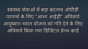 स्वास्थ्य सेवाओं में बड़ा बदलाव ओपीडी परामर्श के लिए “आभा आईडी“ अनिवार्य आयुष्मान भारत योजना को गति देने के लिए अनिवार्य किया गया डिजिटल हेल्थ कार्ड March 25, 2026